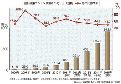 検索サービス事業者の売上高ベースの2011年の市場規模は、推計値だが、前年比70.2%増の187億8000万元(約2253億円)と大幅な伸びを示しそうだ。iResearchでは、今後、伸び率は徐々に落ち着いてくるものの、向こう数年は引き続き拡大基調で推移するとみており、2015年は912億元(1兆0944億円)にまで拡大すると予測している。