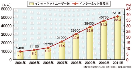 中国のネットビジネスをみるうえで見逃せないのは、巨大な人口とユーザー数の多さである。CNNIC(中国互連網絡信息中心)の統計によれば、2011年12月までに、ネットユーザーは日本の人口数をはるかに超えて、前年比12.2%増の5億1300万人に達している。それでも、総人口をベースとしたネット普及率は、前年比4ポイント増の38.3%に過ぎない。少なく見積もっても、あと数億人分の伸びしろがある。
