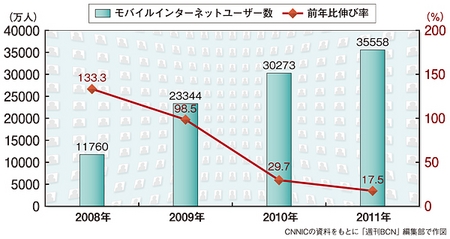 CNNICの調べによれば、ネットサービス利用端末の主要なポジションを占めつつあるモバイルインターネットのユーザーは、2011年12月までに3億5500万人規模にまで拡大。前年比17.5%増の勢いで伸び、すでに米国の人口を超える規模に成長している。2009年の98.5%増の勢いから比べると落ち着いてはきているものの、依然として高い成長率である。