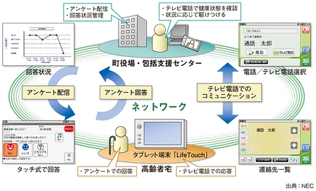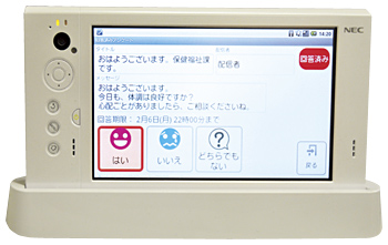 今年1月から白川町が稼働を開始したシステムは、タッチ操作対応の7インチ画面をもつAndroidタブレット「LifeTouch」と通信ネットワークを軸とするものだ。65歳以上の独居世帯へのアンケート配信とテレビ電話の機能を備え、タブレットを活用して高齢者の安否確認や見守りを行う。タブレットなどをNECが提供し、アプリケーション開発は、グループ会社のNECネッツエスアイが担当した。