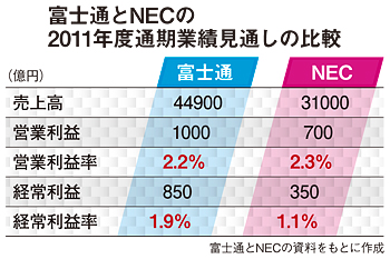 一方、NECは、来年度上期までにグループ会社を含めて1万人規模の人員を削減すると発表。これは、12年度までに売上高4兆円、営業利益率5%の目標を掲げていたが、「今の実力では不可能」(遠藤信博社長)との判断からだ。現状の3兆1000億円の売上規模で、営業利益率5%を目指す方針に転換したわけだ。
