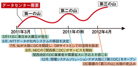 まず、震災が発生して関東地区で電力事情が悪化した直後の2011年3~4月に、大手や外資系の一部の企業が緊急のBCP対策をとり、関西地区をはじめとする非首都圏へのシステム移行に着手した。NTTデータ自身も社内システムを名古屋や大阪のDCに移設することを決断し、現在、システム移行を進行中だ。このように、DCを利用したハウジングサービスの“特需”が生まれ、これが、関西地区におけるDC需要拡大の「第一の山」となった。