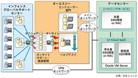 苦心の末、2010年12月、同社はオラクルのサーバー仮想化ソフトウェア「Oracle VM」を利用し、日本ユニシスのIaaS「U-Cloud IaaS」上で、「EBS」の環境を構築した。本番システムを日本ユニシスのデータセンターに預け、追加開発やテスト用途の予備システムをクラウド上で活用している。インフォシスが、インドのグローバルサポートセンターから「EBS」の保守を行う体制を築いた。