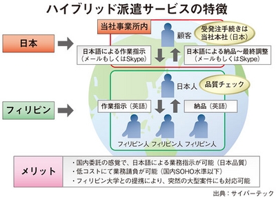 XMLデータベース製品を開発・販売するサイバーテック(橋元賢次社長)は、2008年にオフショア開発拠点として設置したフィリピンのセブ島にある同社のアウトソーシングセンターを使い、国内派遣常駐型と海外オフショアの両方の長所を満たす開発受託サービスを開始する。同社ではこれを「ハイブリッド派遣サービス」として、EC(電子商取引)サイトや媒体サイトなどのウェブ運用や画像変換・加工などの受託案件を狙い、初年度で2億円の売上高を目指す。ウェブなどに関連する受託開発の新興国への流出が激しいなか、同社の取り組みは、他の受託開発会社にも参考になるサービスとして注目される。(取材・文/谷畑良胤:本紙編集長)