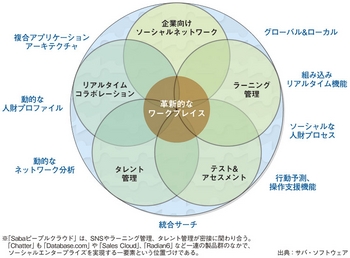 Beat Communicationは、大企業を中心に、累計300社ほどの納入実績をもつ。同社の「Beat Shuffle」には、基盤システムにJavaベースのサービスプラットフォーム「OSGi」を採用している。機能をモジュール化し、アプリケーションの追加や機能の一部更新が容易となった。2012年中に、企業同士が「Beat Shuffle」上で連携できるように対応する予定だ。セールスフォースは、ソーシャルメディアをビジネスに生かすソーシャルエンタープライズを実現する3ステップの一つに、「Chatter」を位置づける。「Database.com」や「Sales Cloud」をはじめとする自社製品群、カスタムアプリと連携させることができるのが強みとなっている。セールスフォースの榎隆司・執行役員プロダクトマーケティングは、「『Force.com』上で動くので、企業内のデータシェアリングやセキュリティ確保が容易」と説明する。タレントマネジメントシステムを開発・販売するサバ・ソフトウェアの企業向けソーシャルネットワーク「Sabaピープルクラウド」に追加される「Sabaソーシャル」は、従業員同士の交流頻度や、結びつきの程度、所属組織から人材の社内コネクションやネットワークへの影響を可視化する機能を備えている。シルクロードテクノロジーや日本IBMも同様の視点に立った取り組みを強化している。