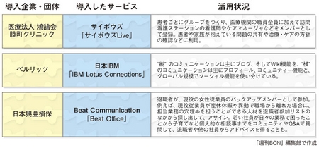 ミック経済研究所によると、「ソーシャアルメディアは、一定規模のコミュニティが存在する大手企業への導入が多く、2010年度で66.7%のウエートを占めている」という。阿部透・調査第三部研究員は、「東日本大震災を受けて、これまでの社内コミュニケーション手段の進化形としてソーシャアルメディアを導入する機運が高まっている」と説明する。サイボウズには、医療機関が地域医療の一環として「サイボウズ Live」を導入した事例がある。患者ごとにグループをつくり、医療機関の職員全員に加えて訪問看護ステーションの看護師やケアマネージャーなどをメンバーとして登録。患者や家族が抱えている問題の共有や治療・ケアの方針の確認などに利用している。日本IBMの行木陽子・ソフトウェア事業Lotsuビジネス戦略エグゼクティブITスペシャリストソーシャルウェアエバンジェリストは、「グローバル化を推進している企業が導入している。研究開発部門でのナレッジ共有や営業支援などでも事例がある」と、用途を紹介する。