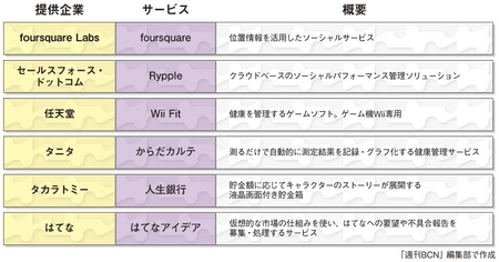 ゲームデザインの技術やメカニズムを他分野に応用するゲーミフィケーションが、注目を浴びている。タニタの「からだカルテ」やタカラトミーの「人生銀行」がそれにあたる。日本IBMは、ソーシャルメディアを利用してもらうための「モチベーションの研究に取り組んでいる。シンプルなユーザーインターフェースで興味を引きそうなものにする必要があると考えている」(行木エバンジェリスト)。サバは、目的特化型のソーシャル環境が構築されていくことになるとみている。キーワードはソーシャルラーニングで、「継続して人を育てていくために、知識の習得と実践をつなぐ。同じ問題を抱えている人同士で各自の疑問や気づきを共有できる」(尾藤伸一代表取締役)。販売モデルとしては、サバが次期製品をソーシャルメディアやパフォーマンス管理、ラーニングなどをすべてセットで提供するほか、「まずは『サイボウズ Live』の価値を広げていく」(丹野瑞紀・グローバル開発本部シニアプロダクトマネージャー)ために無料モデルを当面貫くものや、前述のセールスフォースのようなものなどがある。シンプルなソーシャルメディアを販売する専業ベンダーは、収益が厳しい場合が少なくない。価格や連携性、専門性などで市場の棲み分けが進むか、淘汰される可能性がある。
