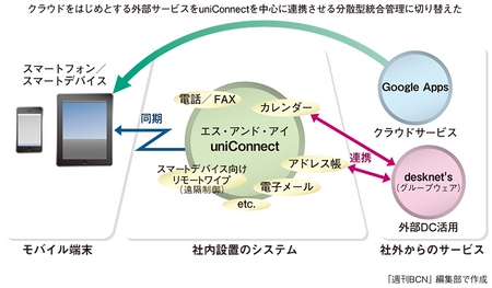 これら電子メールやグループウェア、従来型の電話を統合するシステムとして、エス・アンド・アイのユニファイドコミュニケーションシステム「uniConnect」を社内に置くことを決めた。uniConnect以外で社内に置いたのは、「小田原本社にある財務会計システムと、社員が使うパソコン、スマートデバイスなどの端末くらいなもの」と市川社長がいうように、分散環境を自ら運営するuniConnectで巧みに連携・同期させる仕組みを構築した。