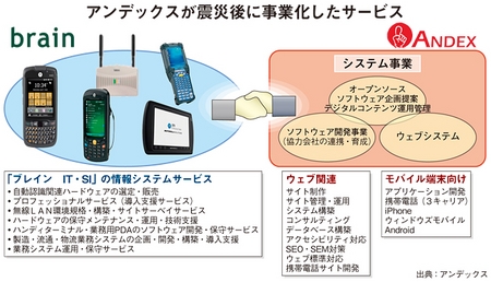 4年前に受託ソフト会社として誕生したベンチャーのアンデックスは、震災後、以前から温めていたスマートデバイス向けのアプリ開発を開始。3G対応のAndroid向け物流・荷受け・配送・追跡システム「SMART-Transport 3G Android」をブレインと開発した。すでにモトローラの日本法人とも連携するなど、複数の案件が発生している。三嶋順社長は、「震災がなければ、あと数年は手をつけなかった事業だろう」と語る。受託ソフト開発は激減したが、引き出しの奥にしまってあった虎の子が窮状を救ったわけだ。