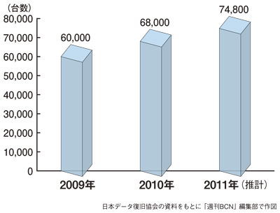 データ復旧サービスの市場規模を推量する目安の一つとなっているのが、最もボリュームの大きいハードディスクドライブ(HDD)の復旧依頼件数である。データ復旧サービスベンダーで構成する業界団体の日本データ復旧協会(濱田兼幸理事長=ワイ・イー・データ社長)の調べによれば、2010年1~12月期の復旧依頼件数は前年比約13%増の約6万8000台で、2011年の推計ベースでは10%増規模の増加が見込まれている。