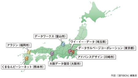 全国のデータ復旧サービスベンダーの数は100~200社ほどあるといわれている。ただ、その多くは簡便なデータ復旧ソフトを使っているケースが多く、物理的な障害まで復旧する本格的なラボ設備を保有しているベンダーは20社程度とみられる。このうち日本データ復旧協会に現時点で加盟しているのは右図の7社。協会は2009年10月にワイ・イー・データなど発起人会社5社によって設立され、直近では2011年10月に大阪データ復旧(大阪市)、12月にはデータワークス(富山市)が新たに加わっている。一定水準以上の設備と技術力を備えた会社の加盟を歓迎しているので、加盟社は今後も増える見通しだ。