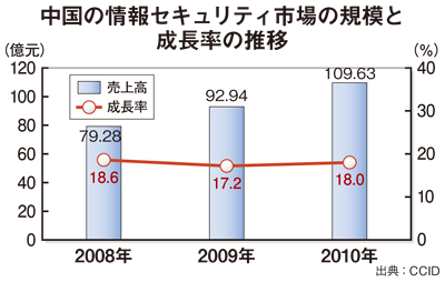 セキュリティ関連製品・サービスも伸び盛りの分野だ。2010年の市場規模は、109億6300万元(約1425億円)で、前年に比べて18.0%成長した。2008年に北京オリンピック、2010年には上海万博が開催されるなど、国際的な大規模イベントが相次いだことで、公共機関のIT化が進み、それに合わせて「大量の情報セキュリティ関連製品が導入された」(CCIDコンサルティング)と分析する。