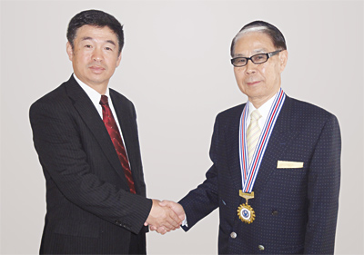 大連市人民政府からは「星海友誼奨」を授与されたJBCCホールディングスの石黒和義会長(右)と、JBグループのビジネスパートナーである大連百易軟件の李遠明総裁。李総裁は大連軟件行業協会(大連ソフトウェア産業協会)会長を務める地場情報サービス業界の重鎮だ