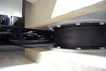 地震の揺れを吸収するために特殊構造の柱を採用している。黒い部分は硬質ゴムのような素材で、揺れをやわらげる効果がある