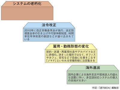 勤怠・就業管理システムの導入のきっかけとして挙げられるのが、システムの老朽化や法令改正、雇用・勤務形態の変化、海外進出だ。2010年に改正労働基準法が施行され、法定割増賃金率の引き上げや代替休暇制度、時間単位年休制度の創設などを受けて、システムの刷新を図る企業の例がみられる。雇用形態は、契約・派遣・再雇用社員やアルバイトなどと多様化しており、事務処理の効率化に新規システムが一役買っている。オフィスではなく、カフェや自宅などで自由に仕事をこなす「ノマド」といわれる勤務形態も注目に値する。ノークリサーチによると、スマートデバイスの新規導入予定は、スマートフォンが4.2%、タブレットが4.2%。今後は増加傾向にあると予想しており、外勤者などの業務効率を向上する手段としてニーズが高まりそうだ。中長期的な勤怠シミュレーションを通じて、システムの活用法や導入形態は多様化していくだろう。海外進出は支店や現地法人の設置を伴うため、導入の余地が大きいといえる。英語版と中国版の「TimePro-XG」を開発・販売するアマノは、海外グループ企業や国内営業との協業を強化。現地進出の日系企業や現地法人に対してアマノ・シンガポール、アマノ・インドネシアを通じて、東南アジア地域を中心に販売活動を展開している。