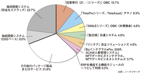 調査会社のノークリサーチによると、年商500億円未満の中堅・中小企業(SMB)市場における勤怠・就業管理システムのシェアトップは、オービックビジネスコンサルタント(OBC)の「就業奉行(21/iシリーズ)」で10.7%。2位以降は、アマノの「TimeProシリーズ、TimeAsset」が8.3%、OSK(大塚商会)の「SMILEシリーズ」が4.8%、日通システムの「勤次郎」が4.8%となっており、順位がめまぐるしく変動しやすい状況にある。基幹系システムと比べて、突出したシェアを獲得する製品が存在しないのも特徴だ。「奉行シリーズ」と「SMILEシリーズ」は、財務会計や販売、人事、給与で多く中小ユーザー企業の支持を得ているベストセラー製品。一方、「TimeProシリーズ」はタイムカードシステムを出自とする製品である。完全にスクラッチベースの独自開発システムの比率も22.7%とまだまだ高く、オープンソースソフトウェアベースの独自開発システムも8.0%のシェアを占めている。