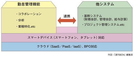 勤怠・就業管理システムの運用形態は、オンプレスをはじめ、ASP/SaaS、IaaS、PaaS、ビジネスプロセスアウトソーシングなどさまざまだ。企業規模やカスタマイズの柔軟性に応じて、システムの提案の幅は広がっている。スマートデバイス対応においては、GPSによる位置情報の取得や情報の閲覧機能など、社員の利用シーンに最適化したユーザーインターフェースを採用したアプリが登場してくるだろう。新規分野として、人的資本を管理するタレントマネジメントシステムとの連携が盛り上がりをみせる可能性がある。連携性という点で興味深いソリューションとして、デジタルコーストが開発・販売する「チームスピリット」がある。セールスフォース・ドットコムのコラボレーションツール「Chatter」を組み込み、出退勤時につぶやいて行動管理したり、社内の情報共有ツールとして汎用的に利用したりすることが可能となっている。SNSに着目しているのが大きな特徴だ。プロジェクト原価管理や経費精算ワークフローなどもワンストップで提供する。今後はスマートデバイスへの対応をはじめ、コラボレーションや分析・ダッシュボードなどの機能強化、基幹系システムや位置情報との連携などを進める方針を打ち出している。企業パフォーマンス管理に発展させるのが目標だ。