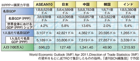 JETROの集計によれば、ASEANの1人あたりの名目GDPは3107ドルで、中国の4382ドルと大きな差はなく、人口ベースでみても約6億人と日本の4.5倍余りも大きい(図参照)。シンガポール、タイ、VIPsに、マレーシアを加えた主要6か国のGDP成長率は5%前後と堅調に伸びている。また、中国とASEANを見渡したとき、製造業の生産拠点の集積が進んでいるのはほぼ共通するが、地場市場に向けた流通・サービス業の拡大で先行しているのは巨大消費市場の上海を抱える中国市場であり、逆に金融サービスの外資への開放度合いでみるとシンガポールを中心とするASEANが先行しているとNRIでは分析している。