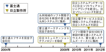 富士通(山本正已社長)と日立製作所(中西宏明社長)のコンピュータ・ITサービス事業体制の見直しが進んでいる。富士通は、4月1日、10社あったソフト子会社を新設の2社に集約して、本社役員をそれらのトップに就けた。過去には、保守・運用サービス会社と中核SI会社を完全子会社化しており、子会社を支配する力を強めてきた。日立製作所も子会社の再編に取り組んできた。SI・ITサービス事業を手がける四つの子会社を2社に統合、通信事業子会社は吸収している。グループ全体を統率するために「分散から集中」に方針を変更し、本社主導のマネジメントを重視し始めた。(木村剛士)