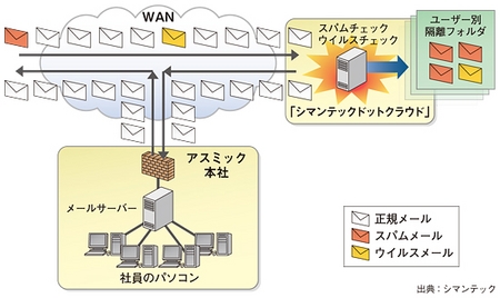 アスミックは、ウイルス・スパム対策の入れ替えにあたって、従来からセキュリティベンダーとして使っていたシマンテックに提案を受け、2011年2月、クラウド型メールセキュリティ「Symantec MessageLabs Email Security.cloud」を導入した。このサービスは、シマンテックがライセンス形態で中堅・中小企業(SMB)向けに展開しているクラウド型セキュリティサービス「ドットクラウド」のうちの一つである。ユーザー企業に送信されるメールを、シマンテック側で「正規メール」「スパムメール」「ウイルスメール」に分類し、スパムメールとウイルスメールを専用のフォルダに隔離する。そして正規メールだけをユーザー企業のメールサーバーに送信するので、ユーザー企業はスパム・ウイルスメールの管理作業がいっさい不要となる。
