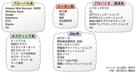 主なクラウドサービスベンダーを分類すると、世界でサービスを展開するグローバル系と、国内メインのホスティング系、プロバイダ/通信系、SIer系、メーカー系の五つに分けられる。グローバル系は、世界7地域にデータセンター(DC)を展開し、パブリッククラウドサービスをリードするAmazon Web Services(AWS)を筆頭に、これを猛追するMicrosoftのWindows Azureなどが挙げられる。KVHやEquinixは従来型のホスティングも手がける一方、外資系だけあって、グローバルに対応したクラウドサービスに強みをもつ。対する国内ベンダーは、ソーシャルメディアや情報共有システムといった情報系システムを対象としたサービスと、ミッションクリティカルな基幹系システムを対象としたサービスとに大別できる。ホスティング系やプロバイダ/通信系は全般的に情報系システムを得意とし、SIer系やメーカー系は大規模な基幹業務システムをメインターゲットに位置づける傾向が強い。
