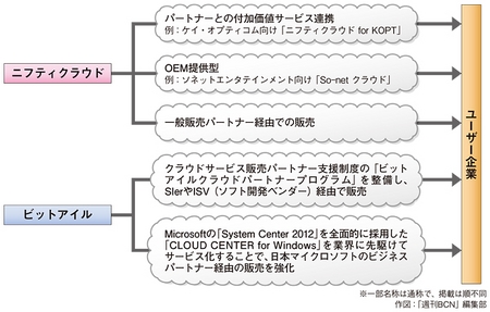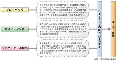 クラウドサービスベンダーのうち、ユーザー企業に最も近いところに位置するSIer以外は、独自に販売チャネルを構築していく必要がある。メーカー系は系列販社を含め、これまでのコンピュータの販売チャネルがそのままクラウドサービスの販路になるケースが多いが、グローバル系、ホスティング系、プロバイダ/通信系は、クラウドサービスを販売するノウハウや営業力があるSIerなどのビジネスパートナーを新たに募る動きが活発化している。