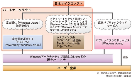 パートナークラウドでは、例えば富士通に「Windows Azure」の技術を供与。富士通は独自に「FGCP/A5Powered by Windows Azure」サービスを開発している。また、プライベートクラウド管理ソフトのパッケージスイート「System Center 2012」を広くDC事業者やSIerに提供することで、“Windows Azureライク”なサービスをビジネスパートナー自身が開発できる環境整備を急ピッチで進めている。仮想化環境やシステム構成管理や稼働監視といったクラウド管理に必要なソフトウェア群をパッケージスイート化するのは、今春製品化した「System Center 2012」が初めてだ。DC事業者がこのスイートで構築したクラウド環境を、販売パートナーであるSIerが売るという販売モデルが想定できる。