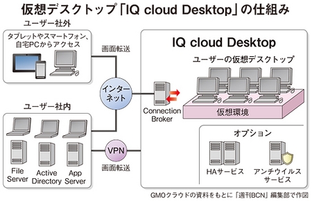 「IQcloud Desktop」は、米デスクトーン社と技術提携し、GMOクラウドが日本国内で販売している。昨年10月27日にサービスの提供を始めた。米国で利用者数が1万人以上という実績をもつ米デスクトーン社の仮想デスクトップ管理ツールを、GMOクラウドのクラウドサービスで構築した仮想基盤上で提供する。