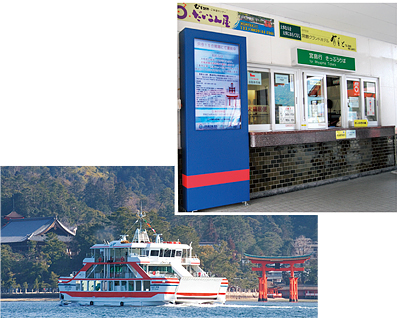 広島県廿日市市の沿岸部から宮島までのフェリーを運航するJR西日本宮島フェリー(上敬二社長)。同社は、近隣の住民と、厳島神社を訪れる観光客のためにフェリーを毎日運航し、多い日では往復で1万人を運ぶ。2011年10月、東芝ITサービス(石橋英次社長)が開発したデジタルサイネージソリューション「びじゅ衛門SaaS」を導入した。運航・観光情報を発信するために、デジタルサイネージをチケット販売場所の近くに設置。販社である中国システム機器(池原堅代表取締役)のサポートが、導入を決断させた。