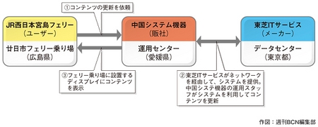 崎谷課長は、要望を満たすためのソリューションとして、東芝ITサービスの「びじゅ衛門SaaS」に着目した。「びじゅ衛門SaaS」は、ディスプレイに表示する映像の配信設定を、ネットワークを通じて行うことができるデジタルサイネージシステムのSaaS版。システムは、東芝ITサービスが運用する東京のデータセンター(DC)にある。文字や音声、静止画、動画を組み合わせて表示でき、管理機能が充実していることが特徴。初期費用が不要で、月額料金制であることも強みとなる。中国システム機器は、これまでのデジタルサイネージソリューションでは、他のITベンダー製品を採用していた。だが、「『びじゅ衛門SaaS』に魅力を感じて、今回初めてJR西日本宮島フェリーの松井課長さんに提案した」(崎谷課長)。また、コストを抑える手段として、広告代理店と組んで広告主を募り、ディスプレイに広告を映して売り上げを得る仕組みもあわせて提案。デジタルサイネージの導入・運用にかかる費用を、広告事業で得た売り上げで賄おうと考えたわけだ。