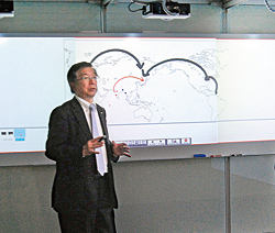 「フューチャークラスルーム」 今回の取材は内田洋行の本社ビルで行った。本社ビルには、最先端の情報システムとIT機器を取り入れた次世代IT教室「フューチャークラスルーム」という施設がある。無線ネットワークとプロジェクタを通じてパソコンから電子教材を電子看板に映し出し、電子ペンで自由に文字や絵を描くことや、画像の拡大・縮小ができる。教室全体の照明の消灯や明るさの調節は、iPadで行うといった操作も可能だ。取材が始まる前、大久保専務自らが、その利点を説明してくれた。大久保専務は、フューチャークラスルームを学校にもっと増やしたい」と話し、教育現場のIT化に向けた熱意を印象づけた。