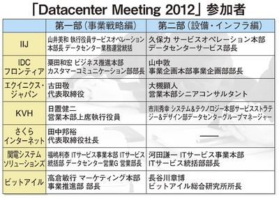 BCN(奥田喜久男社長)は、大手データセンター(DC)事業者の幹部を集めた座談会「DataCenter Meeting 2012」を、4月下旬に開催した。参加したのは、IDCフロンティア、インターネットイニシアティブ(IIJ)、エクイニクス・ジャパン、KVH、関電システムソリューションズ、さくらインターネット、ビットアイルの7社。DCに詳しい東京大学大学院教授の江崎浩氏がモデレータを務め、約3時間、さまざまなテーマで議論が交わされた。前半は、各社の経営幹部が現在のDCを活用したサービスを取り巻く市場環境について意見交換。後半は、DCを運用するうえで悩んでいる技術的課題などについて情報を共有した。主なポイントを解説する。(構成/木村剛士)