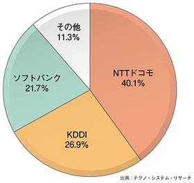 TSRの調査によれば、モバイル通信事業者別のM2M契約回線シェア(2012年見込み)は、NTTドコモが40.1%と首位を獲得しており、続いてKDDI(26.9%)、ソフトバンク(21.7%)というランクになっている。4位にはウィルコムが入る。