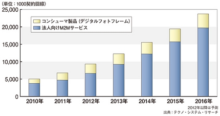 TSRの予測によれば、個人向けと法人向けを合わせたM2Mサービスで利用されているモバイル回線の契約数は、2011年に約680万件となり、2016年には2000万件を突破する見込みだ。M2Mの契約回線は、法人向けの需要拡大にけん引されて、2015年中にモバイル回線全体の10%以上を占めるという。