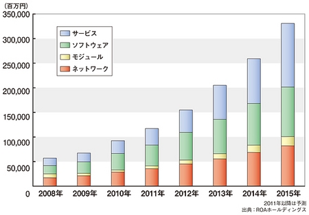 ROAホールディングスによれば、モジュールや通信回線が高価なことや、システム構築に必要なコストの高さが障壁となって、M2Mはこれまで、本格的に普及してこなかった事情があるようだ。しかし、2010年以降は、中国をはじめとする海外のモジュールメーカーの国内市場参入による低価格化や、M2Mプラットフォームの登場によってシステム構築の手間が減少したことを主な理由として、M2M市場は成長の軌道に乗り始めたとみている。市場規模については、ネットワークからサービス(プラットフォームなど)までを含めたM2M関連市場全体は、2010年の1000億円未満から、2015年には3300億円に拡大するという。とくにサービスの分野が活発に伸び、2015年をめどに、M2M関連市場の最も大きいセグメントになることが見込まれている。サービスに並んで、ソフトウェアの分野も勢いよく成長し、ITベンダーにとっての有望領域になりそうだ。