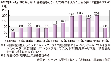 信用調査会社の帝国データバンクによれば、2012年1~4月までのシステム・ソフトウェア開発業者(ソフトハウス)の倒産件数は、2001年以降最悪のペースで推移しているという。リーマン・ショック直後の2009年の同分野の倒産件数は206件だったのに対し、2012年1~4月はすでに88件に到達。また、2001年~2012年4月までのソフトハウスの倒産件数の累計1526件で、負債総額5億円未満の比率が実に93.4%を占めるなど、小規模・零細企業が多いことがうかがい知れる。