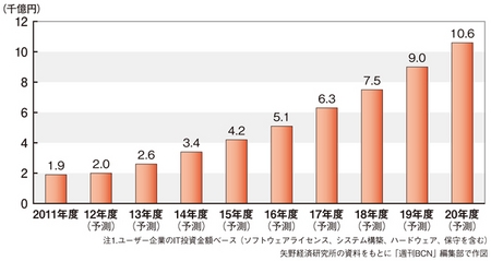 2020年度には国内ビッグデータ関連市場規模が1兆円を超える──。調査会社の矢野経済研究所は、2011年度の1900億円から10年足らずで、国内ビッグデータ関連市場はおよそ5倍に拡大すると予測している。また、野村総合研究所(NRI)が示すITロードマップで鍵を握るとみる「ダイナミック・ケース・マネジメント(DCM)」は、このビッグデータの分析から導き出された結果を、ダイナミックに経営に反映させることを主眼に置く。ビッグデータそのものは、実はユーザー企業にとってあまり意味のあるものではなく、これをビジネスに活用してこそ価値が生まれてくる。ビッグデータから得た知見を分析し、最も適切なアクションを起こし、かつその結果を検証するPDCAサイクルを迅速に回していくITソリューションが、ITベンダーやSIerに求められているというわけだ。矢野経済研究所も、ビッグデータ市場が拡大期に入る2015年以降は、ビッグデータを活用して競争優位を狙うユーザー企業のIT投資が活発化すると予測している。
