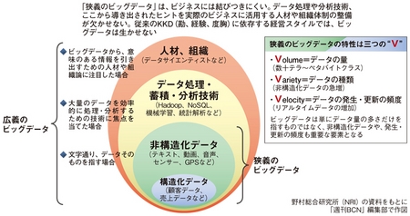 ビッグデータをベースにしてDCMの概念を示したのが下図である。これまでビッグデータといわれてきたものは、実は「狭義のビッグデータ」であり、ビッグデータから意味のある情報を導き出して経営に反映していくには「広義のビッグデータ」を視野に入れていく必要があるとNRIではみている。つまり、例えばカリスマ経営者のKKD(勘・経験・度胸)やセンスに依存した企業風土とビッグデータ活用の相性はよくないし、データを正確に分析する知見も根づきにくい。ITベンダーやSIerがビッグデータ市場を迅速に立ち上げていくには、ユーザー企業にビッグデータ分析の有用性を認識してもらいやすい商品やサービスをつくっていくことが必要となる。ペタバイトクラスの膨大な非構造化データの高速処理・分析システムを、安くて使い勝手がいいものに仕上げると同時に、ユーザー企業の経営方針や人材、組織にまで踏み込んで、ユーザーとともにビッグデータの活用を推進することが、市場拡大に不可欠となる。