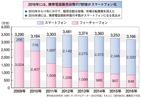 とりわけスマートデバイスには、GPSや加速度センサ、映像・音声を記録できるカメラなどさまざまな情報収集能力が備わっており、これをソーシャルメディアやクラウドサービスを使って極めて効率よく伝播できる。従来型携帯電話がレシプロ機なら、スマートデバイスはジェット機というほどの違いがあって、ここで生成する膨大な位置情報やテキスト、映像、各種センサ情報を企業経営に役立たせようというアプローチがDCMである。下図の通り、2016年には販売ベースでスマートフォンが7割強を占めるようになるとみられている。スマートフォンに内蔵されているようなセンサが低価格化、小型化し、家電や車載などあらゆる機器に組み込まれるようになれば、生成されるデータはさらに大幅に増えることは間違いない。