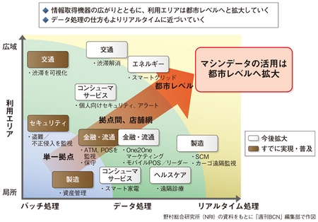 野村総合研究所(NRI)は、スマートデバイスに搭載されている各種センサや「Kinect」「Siri」的なものの応用範囲は、当初の単一デバイスや単一拠点(工場内など)から、複数の拠点間(企業グループ全体など)や都市レベル(スマートコミュニティなど)へと広がっていくものと予測している。こうなれば、得られるデータはもはやモバイルインターネットの比ではなくなるほど膨大になり、DCMへの応用もより一段と活発化するものとみられる。