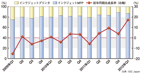 オフィスでは、一般に空調と照明が最も多くの電力を消費し、その次に、パソコンやサーバーなどのIT機器が電力消費の大きな割合を占める。したがって、節電を図るためには、ITを活用して空調や照明の電力消費を抑えるだけではなく、IT機器そのものに対しても節電対策が必要となる。とくに、賃借ビルで空調管理システムなどを導入できない中堅・中小規模のユーザー企業にとって、既存のIT機器を省エネにすぐれた最新モデルに置き換えることが、生産性を損なわない節電への近道となる。もう一つ、節電の対象となるのが、プリンタだ。プリンタは、消費電力が高いレーザープリンタが広く普及しているが、節電のニーズが高まっているなかで、レーザープリンタと比べて消費電力を約8割も抑える小型のインクジェットプリンタが有望なIT商材となるだろう。IDC Japanは、節電ニーズなどにけん引されて、国内のインクジェットプリンタ/MFP(コピーやスキャン機能を一体化した複合機)市場は伸びる傾向にあるとみている。