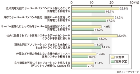 IT活用による節電ソリューションといえば、確かに効果が期待できそうだが、予算や専門人材などのリソースが限られている多くの中堅・中小企業(SMB)にとって、導入のハードルはかなり高い。とはいえ、電力供給事情の緩和やコスト削減のためにも、SMBにとって節電は必須。では、SMBの現場で、どのような節電対策が講じられているのか。SMB市場の調査を得意とするノークリサーチは、今年2~3月、年商500億円未満の民間企業1000社の経営層に、自社の節電対策についてたずねた。その結果、IT機器の入れ替えやIT機器の設定/運用ルールの見直しに取り組むほか、社内のITシステムをデータセンター(DC)に移行しているSMBが比較的多いことがわかった。また、今後の実施予定に関しては、14.7%のSMBが従来型のアプリケーションをSaaSやクラウドへ切り替えることを検討していることが明らかになった。節電を機に、IT資源を自社の電力を消費しない「クラウド」にアウトソーシングする動きが加速化するとみられる。