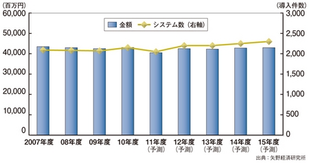 自社ビルや大型施設を保有する大企業にとって有効な節電ツールとなるのは、空調機器や電力機器、照明機器の管理を自動化する「BAS(ビルディングオートメーションシステム)」の導入だ。BASは、設備機器の管理や制御を効率化することによって、エネルギー使用量の削減を図ることができる。調査会社の矢野経済研究所によると、国内のBAS市場は、2011年度にビル建築市場の不況の影響を受けていったん縮小したが、東日本大震災以降の節電ニーズを追い風に、2012年度からはプラス成長に転じるという。昨今のBASソリューションは、ビルのエネルギー設備を統合的に監視して自動制御し、省エネ化を実現する「BEMS(ビル管理システム)」機能が充実しており、節電・コスト削減ともに実現することができる商材として有望視されている。しかし、矢野経済研究所は、BASについてはオープン化が進み、マルチベンダー化によって価格競争が激しくなっており、今後は低価格化に拍車がかかるとみている。2015年までに、システム導入の件数は着実に伸びるものの、金額ベースではほぼ横ばいで推移するという見方だ。そんな状況にあって、ITベンダーは収益性を高めるために、BASに付加価値をつけたかたちで展開することが、これまで以上に重要になってくるとみられる。