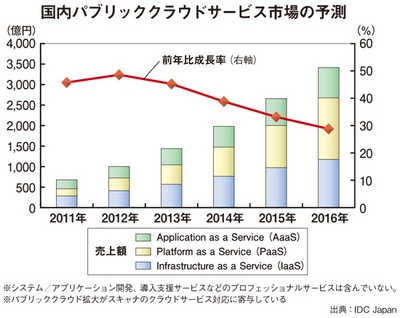 ドキュメントスキャナをクラウドサービスに連携させる動きが活発になってきているのには、クラウドサービスプロバイダが提供している「パブリッククラウド」の利用者の増加が寄与している。調査会社のIDC Japanによれば、国内パブリッククラウドサービス市場は11年に前年比45.9%増の662億円。12年には1000億円規模になる見込みで、16年には11年比5.2倍の3412億円になると予測している。