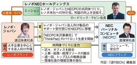 ホールディングスのラピン会長、レノボ・ジャパンの渡辺社長、NECPCの高塚社長は、毎週月曜日にミーティングを開き、3人で共同ビジネスの方針を決定している。ラピン会長に3人の力関係についてたずねたら、「重要な事項は平等な立場で決定している」と答えた。また、高塚社長は、「共同ビジネスの方針に関して3人ともスタンスが一致している」と、経営トップの一体感をアピールしている。