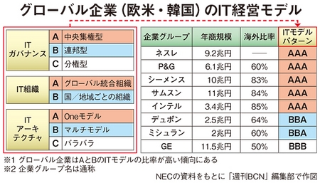 国内に限ってみれば、ERPは導入二巡目、三巡目の成熟市場であるものの、日系企業の多くが進出する中国・ASEANのアジア成長市場全体で捉えると、「これまでになかった新しい市場が見えてくる」とB-EN-Gの三島良太・営業本部営業3部長はコメントする。ERPは国内外に展開するグループ企業の販売・財務・給与・生産など基幹情報を統合するシステムだが、その構築のあり方を区分してみると「ITガバナンス」や「IT組織」「ITアーキテクチャ」など各階層ごとにグローバル統一仕様にするか、地域ごとに最適化するのかに大きく分かれる(図参照)。