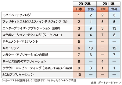 調査会社のガートナー ジャパンによると、世界が重視するビジネス戦略では、コストを削減する一方で、「成長を加速する」「新規顧客を獲得・維持する」という強い姿勢がみられる。日本でもこの傾向は共通しているが、「IT人材の確保・育成」「新規市場や地域への業務拡大」が上位にランクインした。世界が優先するテクノロジは、アナリティクスとBI(ビジネス・インテリジェンス)、モバイル・テクノロジ、SaaS/PaaS/IaaS(クラウド・コンピューティング)、コラボレーション・テクノロジ(ワークフロー)がそれぞれ1位から4位に入った。一方、日本では、3位にERP(エンタープライズ・アプリケーション)がランクインし、SaaS/PaaS/IaaSは9位(2011年は1位)に低迷する結果となった。ビジネス面でのITの貢献度に関しては、世界では「顧客経験価値」「企業の学習と成長」「顧客エンゲージメント」の順であったのに対して、日本では「生産/サービスの創造」が圧倒的で、「企業の学習と成長」は最下位という結果だった。