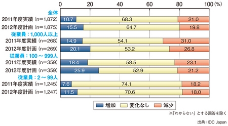 調査会社のIDC Japanによると、国内企業の2012年度のIT投資意欲は、大きな高まりは期待できないものの、回復に向けた変化が現れている。回答した企業のうち、「増加させる」とする企業は15.5%で、「減少させる」とする企業は19.8%だった。前年度と比べると、「増加させる」の回答比率が4.8ポイント増加した一方で、「減少させる」回答が0.2ポイント減少したことが明らかになった。一部で、前年度に比べてIT投資を「増加させる」とする回答が「減少させる」とする回答を上回った。(文/信澤健太)