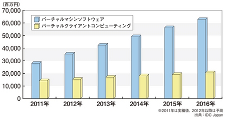 国内仮想化ソフト市場は拡大傾向にある。IDC Japanによれば、2011年はハイパーバイザーの「バーチャルマシンソフト」が前年比43.0%増の280億3200万円に拡大。デスクトップ仮想化など「バーチャルクライアントコンピューティング」が前年比7.4%増の141億6900万円となった。2011~2016年のCAGR(年平均成長率)は、バーチャルマシンソフトが17.5%、バーチャルクライアントコンピューティングが7.4%と予測している。