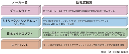 ヴイエムウェアは販社向けに、ソリューションに特化したトレーニングや販売支援プログラムを拡充している。シトリックス・システムズ・ジャパンは、販社が顧客開拓しやすいようにVDI(仮想デスクトップインフラ)分野でSMB向けアプライアンス「Citrix VDI-in-a-Box」を発売した。日本マイクロソフトは、SMBのサーバー仮想化導入を促進するために、富士通マーケティング(FJM)と協業した。レッドハットは、ユーザー企業が契約期間であれば製品の最新バージョンを常に利用でき、しかも最大10年間のサポートと保守が受けられる「サブスクリプション」を提供し、販社に好評を博している。